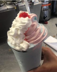 Hot fudge floating on top of an extra thick shake of your favorite flavor, with whipped cream and a cherry!